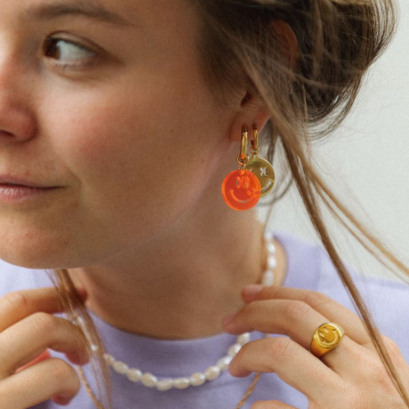 This neon orange smiley earring is a perfect touch to your outfit.🧡